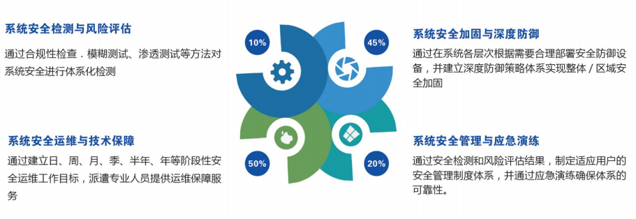 公司專業安全服務團隊根據項目的應用、數據等安全需求,為業主定制信息安全運營體系,以木桶短板視角,從采集、傳輸、存儲、使用、共享、銷毀的六大生命周期著手,以風險識別、安全防御、安全檢測、安全響應和安全恢復五大能力為建設思路,將制防、人防、技防完全貫通于安全運營體系,通過安全體系規劃對三防的所有流程進行監管,使制度可落地、權責分明,人員能提升安全意識、量化考核,技術能力可提升、有作用,預防安全事故的發生。
